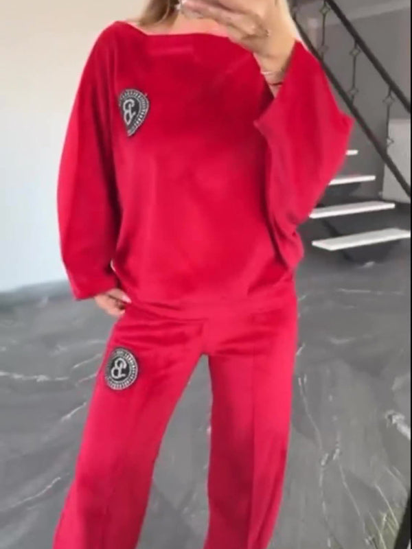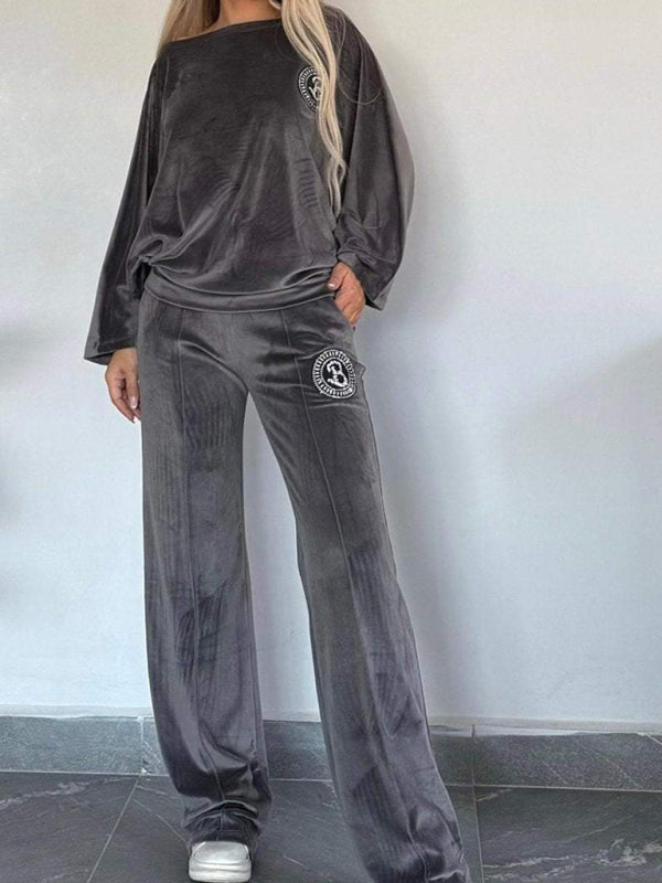 Gold velvet solid color round neck bat sleeves casual two-piece set