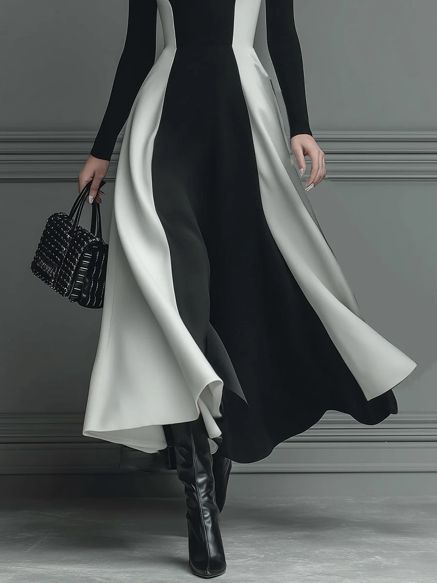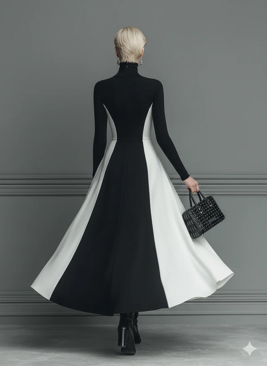 Make a bold statement with the 'Mod-Chic' Knit Dress. This piece masterfully uses color-blocking techniques to create a stunning visual contrast that naturally contours your body and highlights your silhouette. Featuring a sophisticated turtleneck for added warmth and a sleek slim-fit cut, it offers the perfect blend of modern art and everyday comfort. Whether you're commanding a meeting or meeting friends for dinner, this dress ensures you look effortlessly polished.
